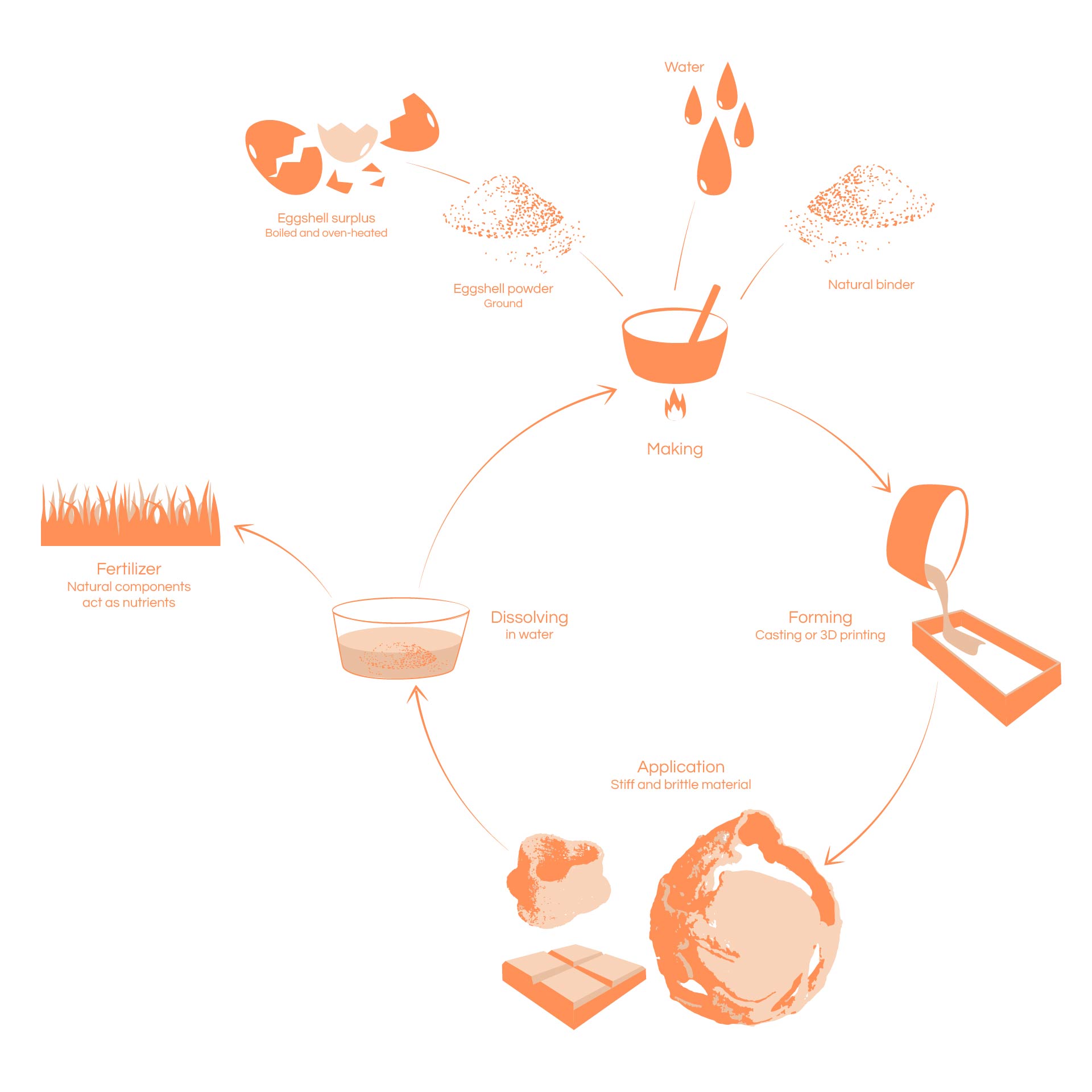 Para fabricar las piezas, se siguieron cinco pasos: trituración (del cascarón en polvo), calentamiento (la mezcla de componentes), conformado (fundición o impresión 3D), enfriamiento (para acelerar el proceso de desmoldeo) y secado (natural). Las piezas de EGG-SHIELD están compuestas de: matriz polimérica de gelatina (12,2% en peso) con agua (29,2 % en peso) reforzada con cáscara de huevo (58,5 % en peso). ¿Y qué formas se obtienen? El comportamiento natural de las cáscaras permite que se muevan libremente por el molde y se creen proyectos únicos. Cuando el material se seca, adopta características similares a las de nuestros huesos, cemento o una cerámica.
